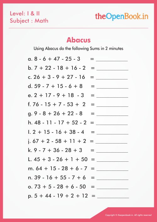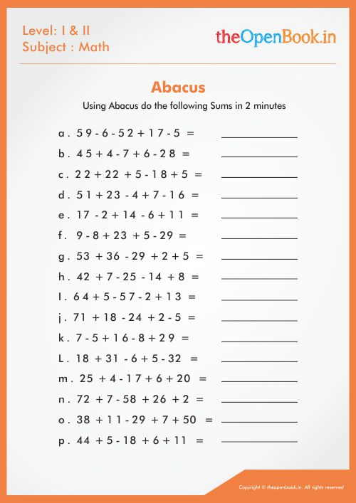 Tags : Grade 4, CBSE, NCERT, ICSE, Printable Worksheet, Using Abacus do the following Sums in 2 minutes 07
