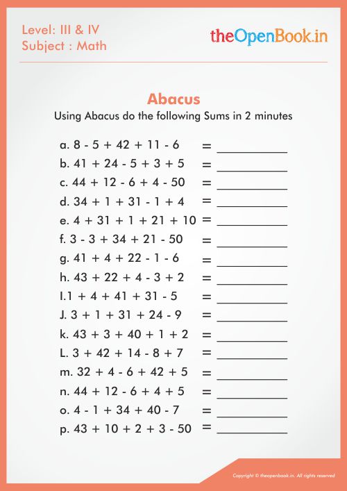Tags : Grade 4, CBSE, NCERT, ICSE, Printable Worksheet, Using Abacus do the following Sums in 2 minutes 08